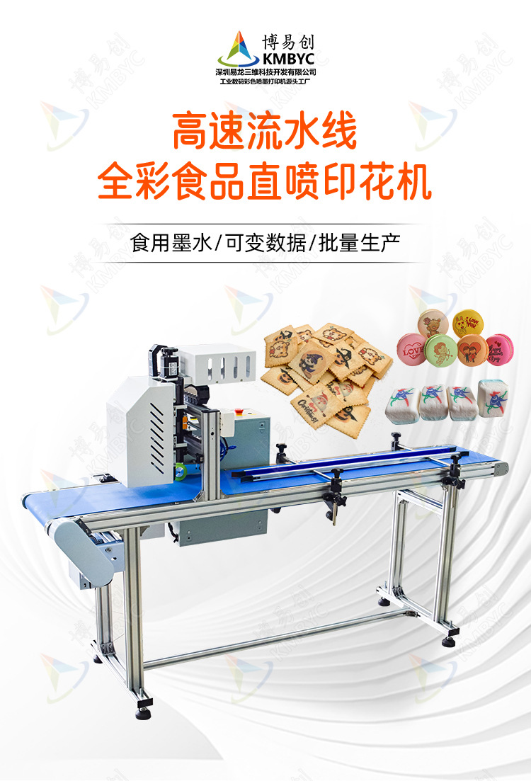 產品介紹:博易創馬卡龍食品打印機采用惠普品牌噴頭。打印寬度為33cm-66cm,進料寬度為30cm。不需要制版就能一鍵完成打印。專用食品行業墨水。適合小批量食品印花